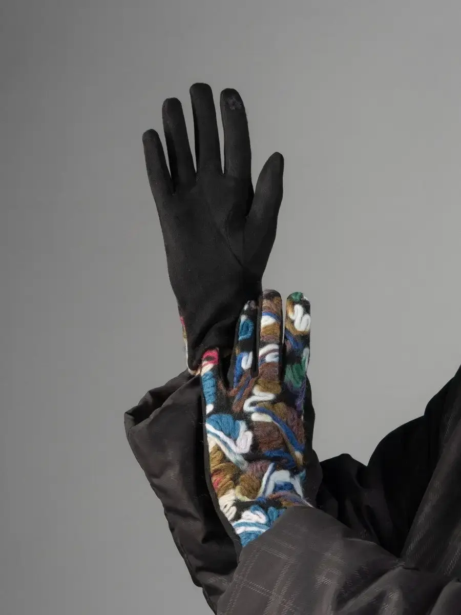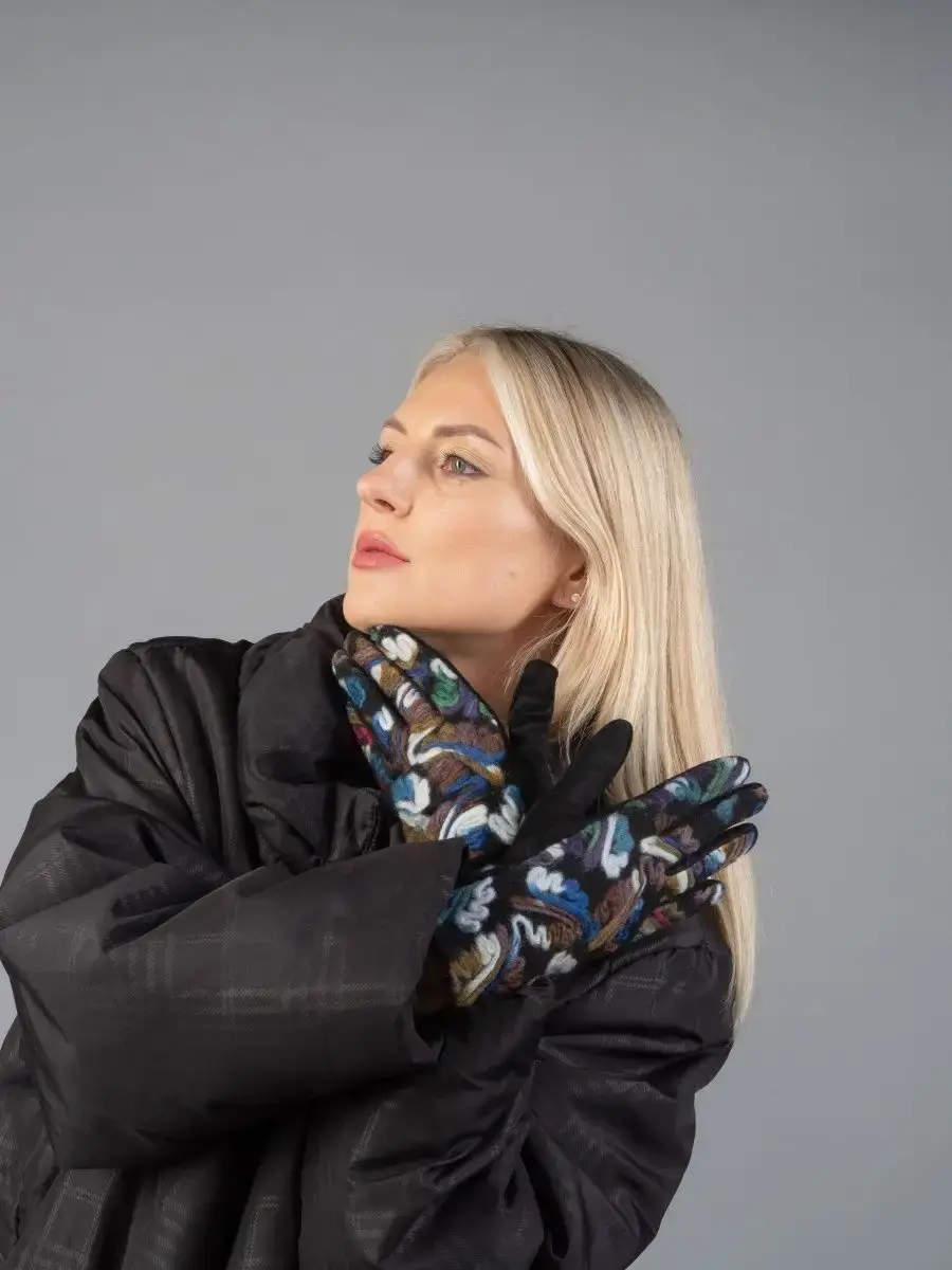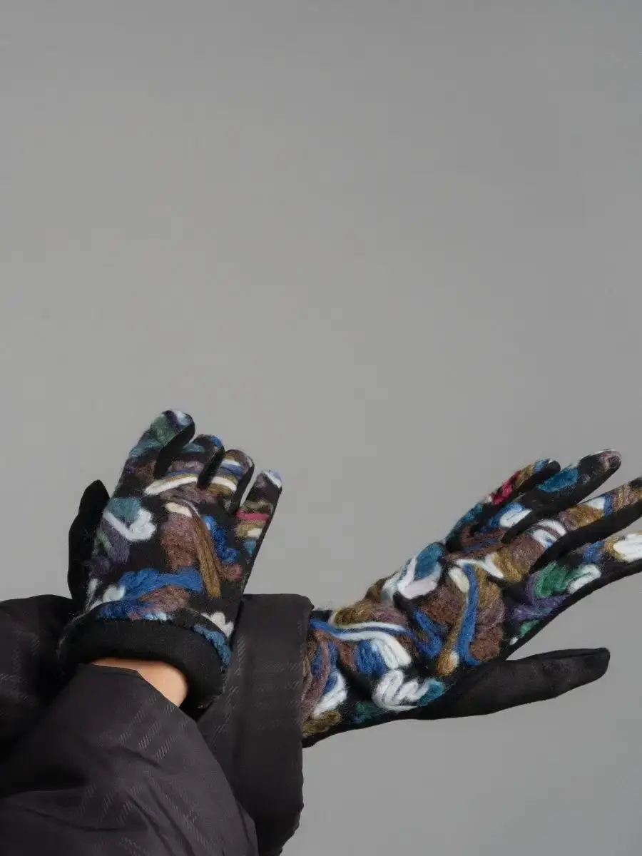 Женские перчатки с цветными вышитыми абстрактными узорами из шерстяной нити.Материал теплых перчаток достаточно эластичный и хорошо облегает руку.Качественная фурнитура, отличная посадка и простой уход, сделают носку комфортной и приятной.Размер универсальный