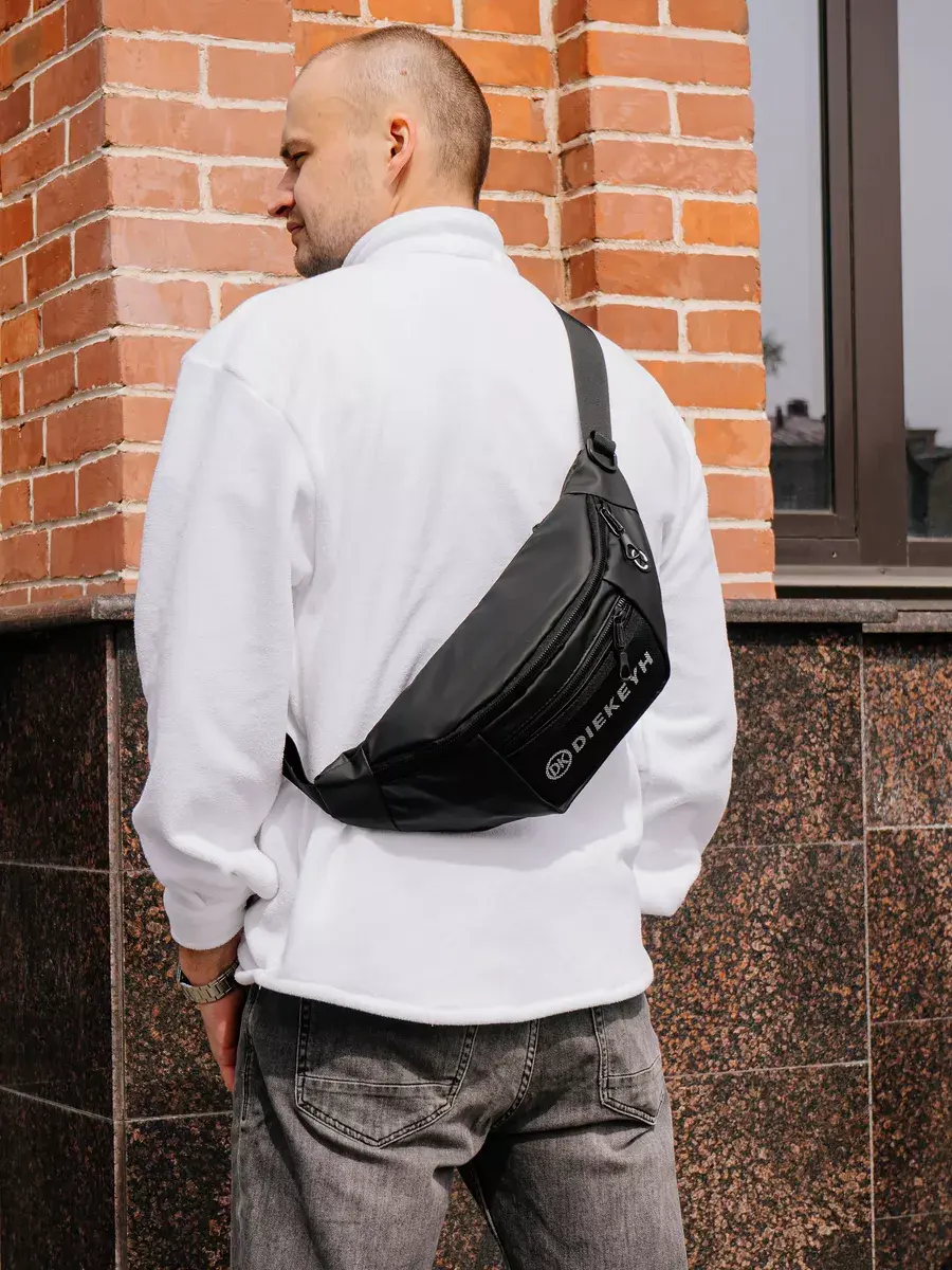 Сумка мужская через плечо кросс-боди - это необычная и крутая сумочка банан небольшого размера с легким весом 300 гр из прочного влагозащитного текстиля с внутренними и наружными кармашками для телефона, под документы на машину, для ключей и различных мелочей. Модный мини аксессуар предусматривает ношение через плечо кросс боди на груди или на бок, а также на поясе или бедре, что полностью освобождает руки, дарит комфорт в повседневной носке.